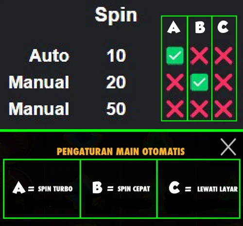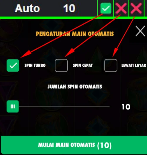 Pola yang digunakan adalah: Spin Otomatis 10x (Auto), Spin Turbo aktif, Spin Cepat tidak aktif, dan Lewati Layar tidak aktif.